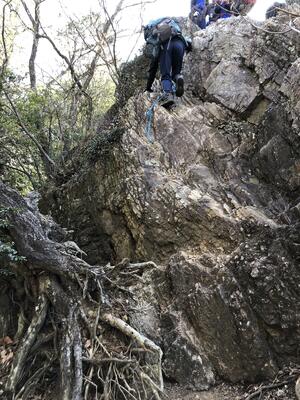 中倉山は山頂へ続く尾根に着くまでの区間の傾斜がきついため、生徒も苦労していました。筋力に頼ってばかりだと疲れてしまうた