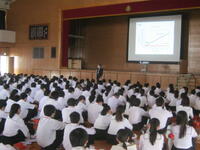時差の関係で、まず三好博士はスイスで研究しいてるYang博士を紹介してくださって、Yang博士がまず講話をしてくださいました。中国の大学を卒業して、ドイツの大学で修士を取得し、そして現在はスイスで博士として活躍しています。とても柔らかい笑顔の素敵な優しい方で、大変興味深い話をしてくださいました。生徒たちが真剣に話を聞き、その後、英語で質疑応答を行いました。