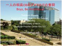 アクロン大学は、高分子ポリマーの分野では世界NO.1であり、マサチューセッツ工科大学や、オックスフォード、東京大学より評価は上だそうで、そんな世界をリードする大学で研究をできたのはたった1回の静岡での学会での発表がきっかけだったようです!