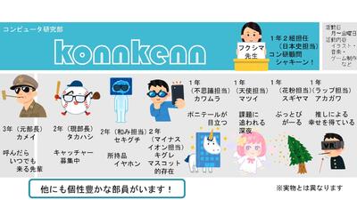 | ひとこと | ゲーム制作、DTM、イラスト作成など、パソコンを使って日々活動しています。通称”コン研”! 変わった人も多いけれど、興味があったらぜひともおいでください。年度途中参加も歓迎です! |