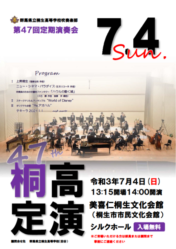 新型コロナウイルス感染対策として、桐生高校関係者のみの観覧とさせていただきましたが、盛況のうちに演奏会を終えることができました。様々な形でご支援いただいた皆様、ご来場いただいた皆様、本当にありがとうございました。