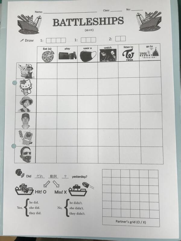 左から順に、プレゼン(ペアで洋楽解説)・英字新聞を使った会話練習・ALTによるゲーム(Battleships)の模様です。